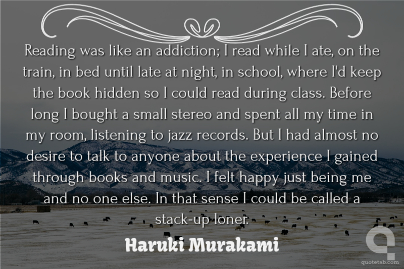 Reading was like an addiction; I read while I ate, on the train, in bed until late at night, in school, where I'd keep the book hidden so I could read during class. Before long I bought a small stereo and spent all my time in my room, listening to jazz records. But I had almost no desire to talk to anyone about the experience I gained through books and music. I felt happy just being me and no one else. In that sense I could be called a stack-up loner.