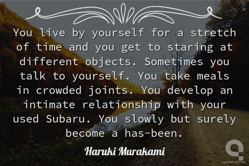 You live by yourself for a stretch of time and you get to staring at different objects. Sometimes you talk to yourself. You take meals in crowded joints. You develop an intimate relationship with your used Subaru. You slowly but surely become a has-been.