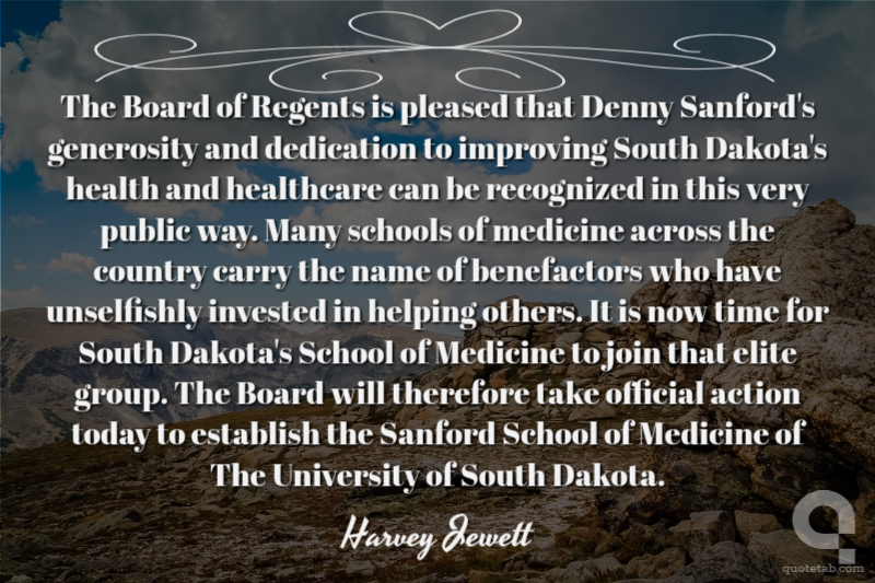 The Board of Regents is pleased that Denny Sanford's generosity and dedication to improving South Dakota's health and healthcare can be recognized in this very public way. Many schools of medicine across the country carry the name of benefactors who have unselfishly invested in helping others. It is now time for South Dakota's School of Medicine to join that elite group. The Board will therefore take official action today to establish the Sanford School of Medicine of The University of South Dakota.