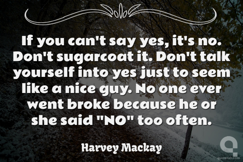 If you can't say yes, it's no. Don't sugarcoat it. Don't talk yourself into yes just to seem like a nice guy. No one ever went broke because he or she said "NO" too often.
