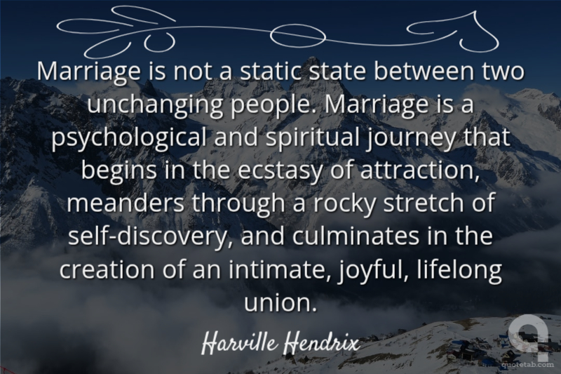 Marriage is not a static state between two unchanging people. Marriage is a psychological and spiritual journey that begins in the ecstasy of attraction, meanders through a rocky stretch of self-discovery, and culminates in the creation of an intimate, joyful, lifelong union.