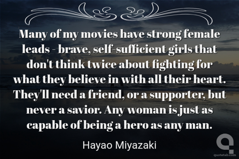 Many of my movies have strong female leads - brave, self-sufficient girls that don't think twice about fighting for what they believe in with all their heart. They'll need a friend, or a supporter, but never a savior. Any woman is just as capable of being a hero as any man.
