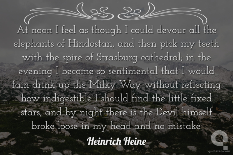 At noon I feel as though I could devour all the elephants of Hindostan, and then pick my teeth with the spire of Strasburg cathedral; in the evening I become so sentimental that I would fain drink up the Milky Way without reflecting how indigestible I should find the little fixed stars, and by night there is the Devil himself broke loose in my head and no mistake.