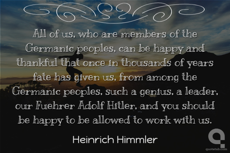 All of us, who are members of the Germanic peoples, can be happy and thankful that once in thousands of years fate has given us, from among the Germanic peoples, such a genius, a leader, our Fuehrer Adolf Hitler, and you should be happy to be allowed to work with us.