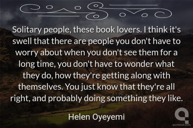 Solitary people, these book lovers. I think it's swell that there are people you don't have to worry about when you don't see them for a long time, you don't have to wonder what they do, how they're getting along with themselves. You just know that they're all right, and probably doing something they like.