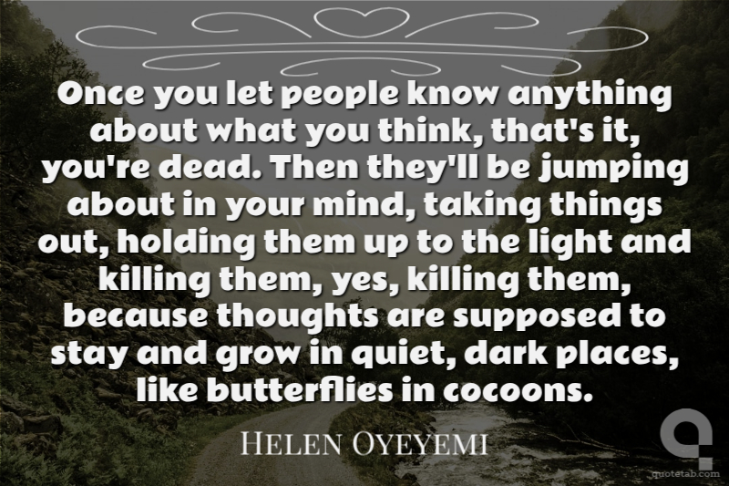 Once you let people know anything about what you think, that's it, you're dead. Then they'll be jumping about in your mind, taking things out, holding them up to the light and killing them, yes, killing them, because thoughts are supposed to stay and grow in quiet, dark places, like butterflies in cocoons.
