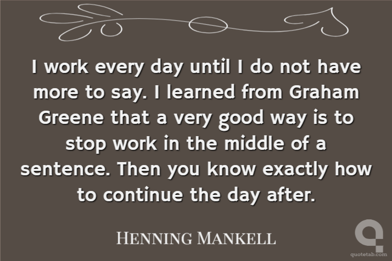 I work every day until I do not have more to say. I learned from Graham Greene that a very good way is to stop work in the middle of a sentence. Then you know exactly how to continue the day after.