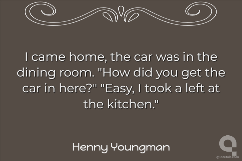 I came home, the car was in the dining room. "How did you get the car in here?" "Easy, I took a left at the kitchen."