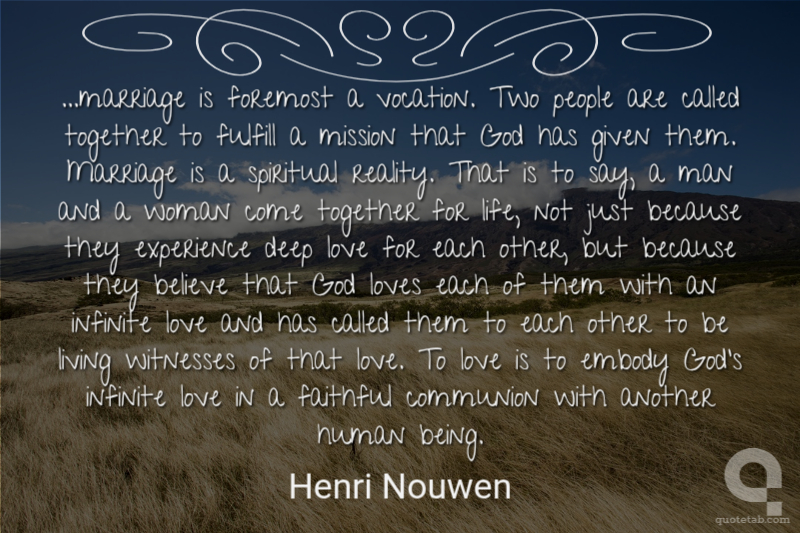 ...marriage is foremost a vocation. Two people are called together to fulfill a mission that God has given them. Marriage is a spiritual reality. That is to say, a man and a woman come together for life, not just because they experience deep love for each other, but because they believe that God loves each of them with an infinite love and has called them to each other to be living witnesses of that love. To love is to embody God's infinite love in a faithful communion with another human being.