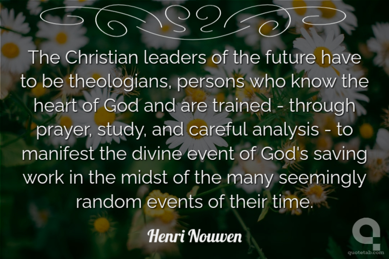 The Christian leaders of the future have to be theologians, persons who know the heart of God and are trained - through prayer, study, and careful analysis - to manifest the divine event of God's saving work in the midst of the many seemingly random events of their time.