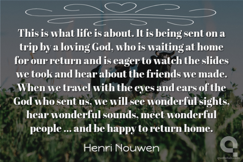This is what life is about. It is being sent on a trip by a loving God, who is waiting at home for our return and is eager to watch the slides we took and hear about the friends we made. When we travel with the eyes and ears of the God who sent us, we will see wonderful sights, hear wonderful sounds, meet wonderful people ... and be happy to return home.