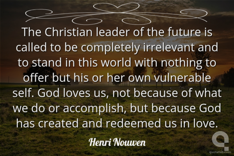 The Christian leader of the future is called to be completely irrelevant and to stand in this world with nothing to offer but his or her own vulnerable self. God loves us, not because of what we do or accomplish, but because God has created and redeemed us in love.