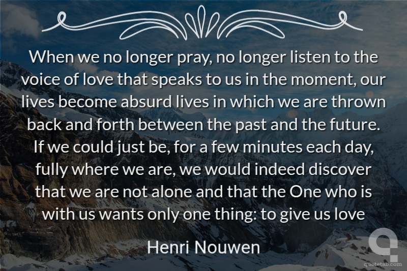 When we no longer pray, no longer listen to the voice of love that speaks to us in the moment, our lives become absurd lives in which we are thrown back and forth between the past and the future. If we could just be, for a few minutes each day, fully where we are, we would indeed discover that we are not alone and that the One who is with us wants only one thing: to give us love