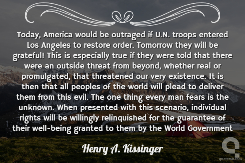 Today, America would be outraged if U.N. troops entered Los Angeles to restore order. Tomorrow they will be grateful! This is especially true if they were told that there were an outside threat from beyond, whether real or promulgated, that threatened our very existence. It is then that all peoples of the world will plead to deliver them from this evil. The one thing every man fears is the unknown. When presented with this scenario, individual rights will be willingly relinquished for the guarantee of their well-being granted to them by the World Government