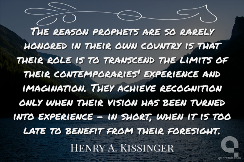 The reason prophets are so rarely honored in their own country is that their role is to transcend the limits of their contemporaries' experience and imagination. They achieve recognition only when their vision has been turned into experience - in short, when it is too late to benefit from their foresight.