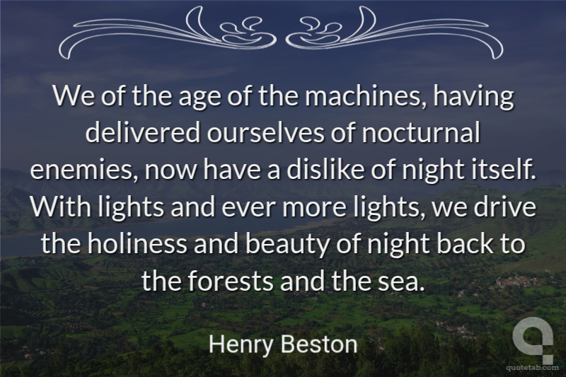 We of the age of the machines, having delivered ourselves of nocturnal enemies, now have a dislike of night itself. With lights and ever more lights, we drive the holiness and beauty of night back to the forests and the sea.