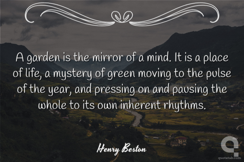 A garden is the mirror of a mind. It is a place of life, a mystery of green moving to the pulse of the year, and pressing on and pausing the whole to its own inherent rhythms.