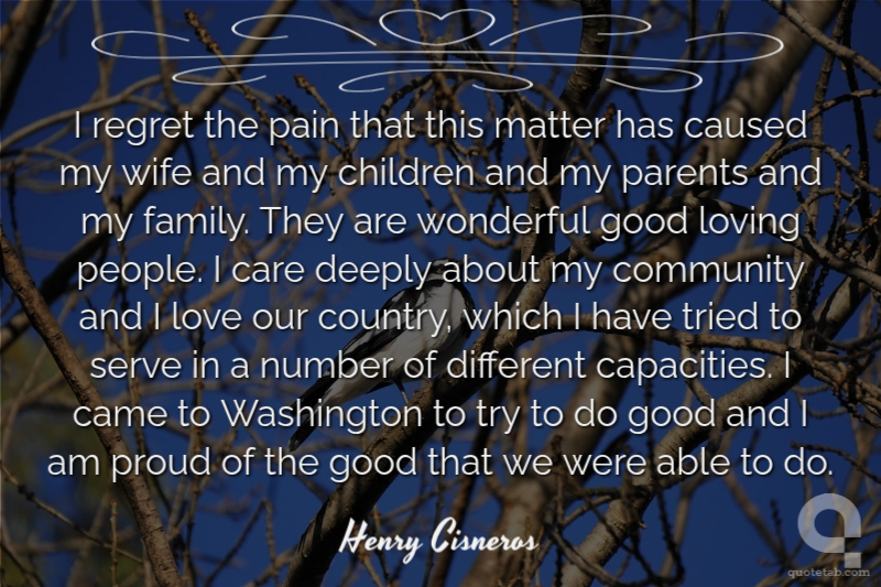 I regret the pain that this matter has caused my wife and my children and my parents and my family. They are wonderful good loving people. I care deeply about my community and I love our country, which I have tried to serve in a number of different capacities. I came to Washington to try to do good and I am proud of the good that we were able to do.