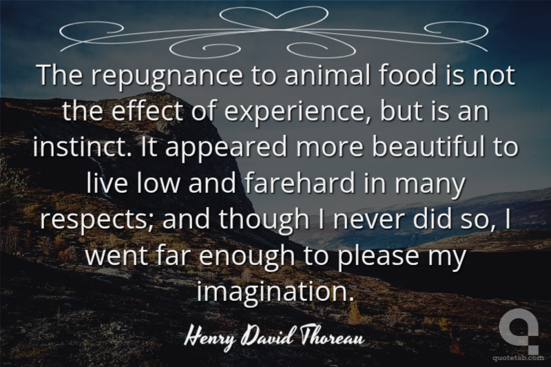 The repugnance to animal food is not the effect of experience, but is an instinct. It appeared more beautiful to live low and farehard in many respects; and though I never did so, I went far enough to please my imagination.