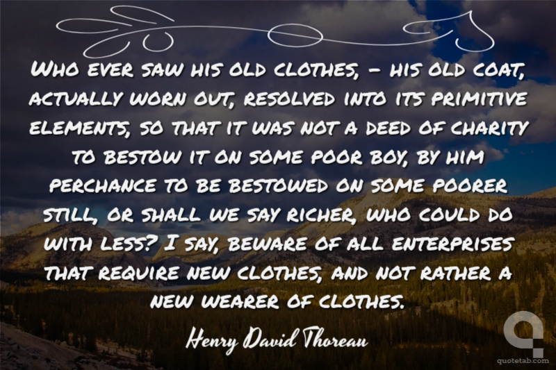 Who ever saw his old clothes, - his old coat, actually worn out, resolved into its primitive elements, so that it was not a deed of charity to bestow it on some poor boy, by him perchance to be bestowed on some poorer still, or shall we say richer, who could do with less? I say, beware of all enterprises that require new clothes, and not rather a new wearer of clothes.