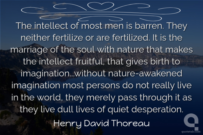 The intellect of most men is barren. They neither fertilize or are fertilized. It is the marriage of the soul with nature that makes the intellect fruitful, that gives birth to imagination...without nature-awakened imagination most persons do not really live in the world, they merely pass through it as they live dull lives of quiet desperation.