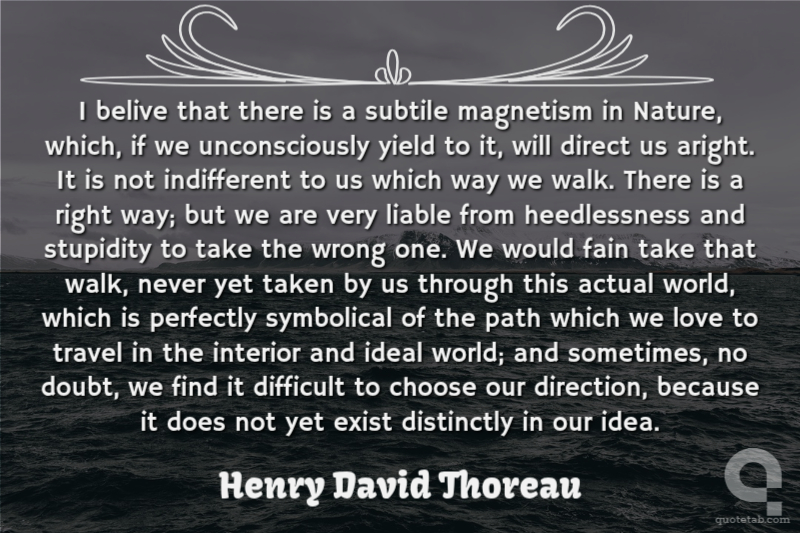 I belive that there is a subtile magnetism in Nature, which, if we unconsciously yield to it, will direct us aright. It is not indifferent to us which way we walk. There is a right way; but we are very liable from heedlessness and stupidity to take the wrong one. We would fain take that walk, never yet taken by us through this actual world, which is perfectly symbolical of the path which we love to travel in the interior and ideal world; and sometimes, no doubt, we find it difficult to choose our direction, because it does not yet exist distinctly in our idea.