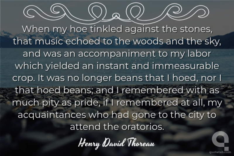 When my hoe tinkled against the stones, that music echoed to the woods and the sky, and was an accompaniment to my labor which yielded an instant and immeasurable crop. It was no longer beans that I hoed, nor I that hoed beans; and I remembered with as much pity as pride, if I remembered at all, my acquaintances who had gone to the city to attend the oratorios.