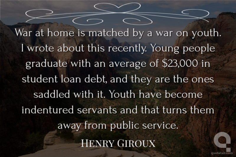 War at home is matched by a war on youth. I wrote about this recently. Young people graduate with an average of $23,000 in student loan debt, and they are the ones saddled with it. Youth have become indentured servants and that turns them away from public service.