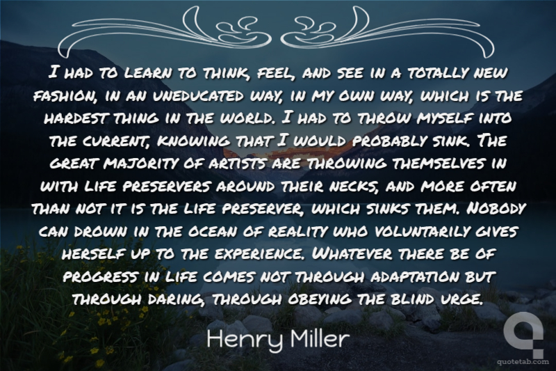 I had to learn to think, feel, and see in a totally new fashion, in an uneducated way, in my own way, which is the hardest thing in the world. I had to throw myself into the current, knowing that I would probably sink. The great majority of artists are throwing themselves in with life preservers around their necks, and more often than not it is the life preserver, which sinks them. Nobody can drown in the ocean of reality who voluntarily gives herself up to the experience. Whatever there be of progress in life comes not through adaptation but through daring, through obeying the blind urge.