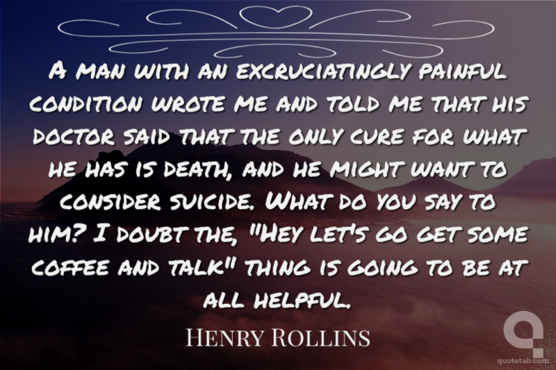 A man with an excruciatingly painful condition wrote me and told me that his doctor said that the only cure for what he has is death, and he might want to consider suicide. What do you say to him? I doubt the, "Hey let's go get some coffee and talk" thing is going to be at all helpful.