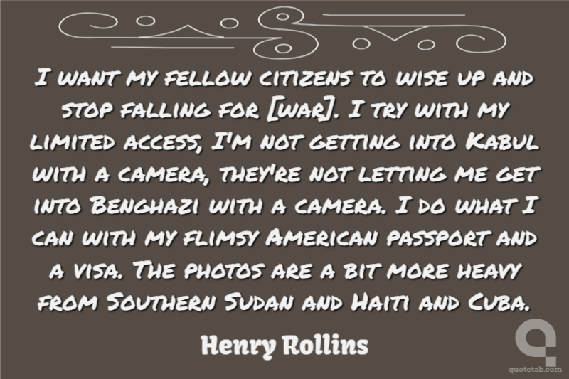 I want my fellow citizens to wise up and stop falling for [war]. I try with my limited access, I'm not getting into Kabul with a camera, they're not letting me get into Benghazi with a camera. I do what I can with my flimsy American passport and a visa. The photos are a bit more heavy from Southern Sudan and Haiti and Cuba.