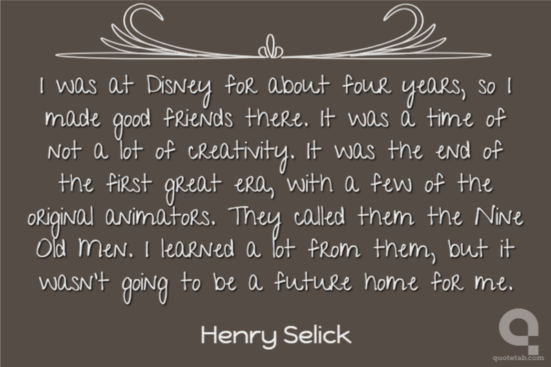 I was at Disney for about four years, so I made good friends there. It was a time of not a lot of creativity. It was the end of the first great era, with a few of the original animators. They called them the Nine Old Men. I learned a lot from them, but it wasn't going to be a future home for me.