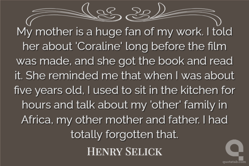 My mother is a huge fan of my work. I told her about 'Coraline' long before the film was made, and she got the book and read it. She reminded me that when I was about five years old, I used to sit in the kitchen for hours and talk about my 'other' family in Africa, my other mother and father. I had totally forgotten that.