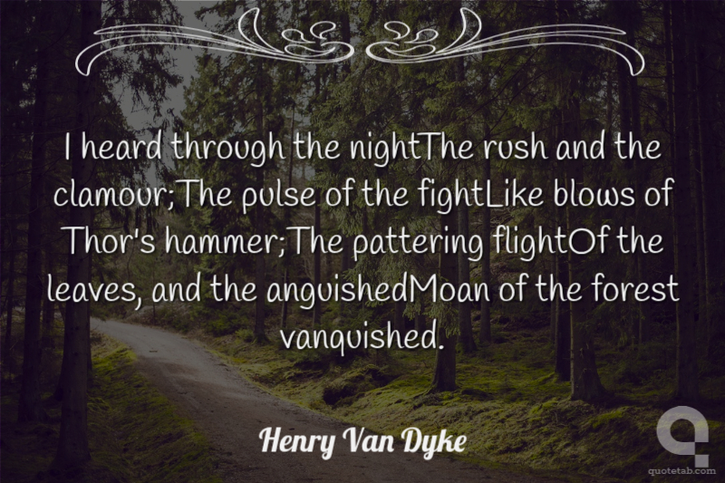 I heard through the nightThe rush and the clamour;The pulse of the fightLike blows of Thor's hammer;The pattering flightOf the leaves, and the anguishedMoan of the forest vanquished.