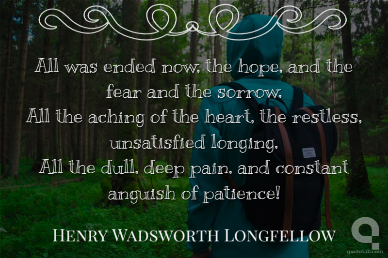 All was ended now, the hope, and the fear and the sorrow, All the aching of the heart, the restless, unsatisfied longing, All the dull, deep pain, and constant anguish of patience!
