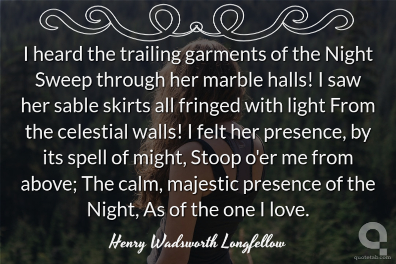 I heard the trailing garments of the Night Sweep through her marble halls! I saw her sable skirts all fringed with light From the celestial walls! I felt her presence, by its spell of might, Stoop o'er me from above; The calm, majestic presence of the Night, As of the one I love.