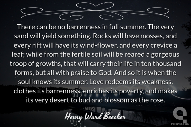 There can be no barrenness in full summer. The very sand will yield something. Rocks will have mosses, and every rift will have its wind-flower, and every crevice a leaf; while from the fertile soil will be reared a gorgeous troop of growths, that will carry their life in ten thousand forms, but all with praise to God. And so it is when the soul knows its summer. Love redeems its weakness, clothes its barrenness, enriches its poverty, and makes its very desert to bud and blossom as the rose.