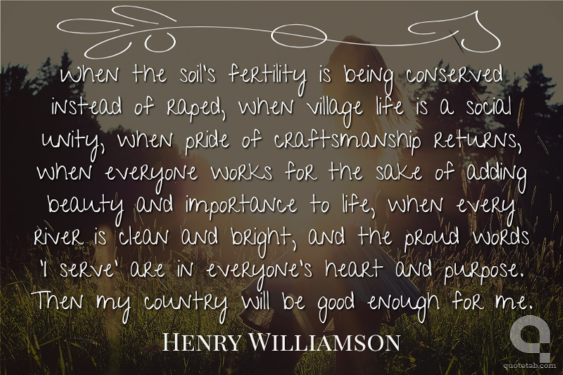 When the soil's fertility is being conserved instead of raped, when village life is a social unity, when pride of craftsmanship returns, when everyone works for the sake of adding beauty and importance to life, when every river is clean and bright, and the proud words 'I serve' are in everyone's heart and purpose. Then my country will be good enough for me.
