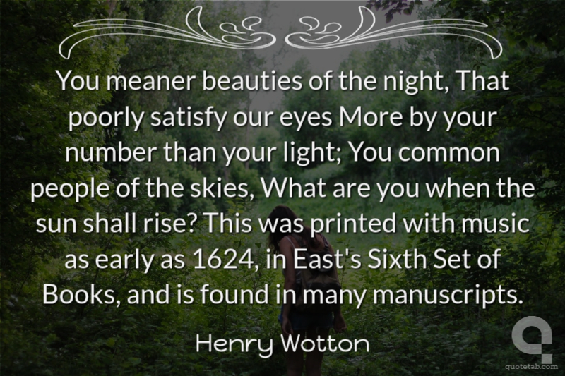 You meaner beauties of the night, That poorly satisfy our eyes More by your number than your light; You common people of the skies, What are you when the sun shall rise? This was printed with music as early as 1624, in East's Sixth Set of Books, and is found in many manuscripts.