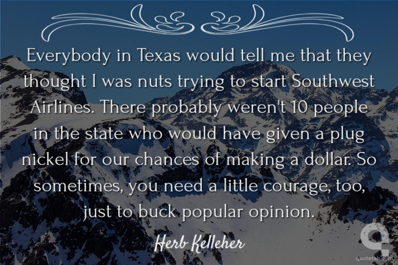 Everybody in Texas would tell me that they thought I was nuts trying to start Southwest Airlines. There probably weren't 10 people in the state who would have given a plug nickel for our chances of making a dollar. So sometimes, you need a little courage, too, just to buck popular opinion.