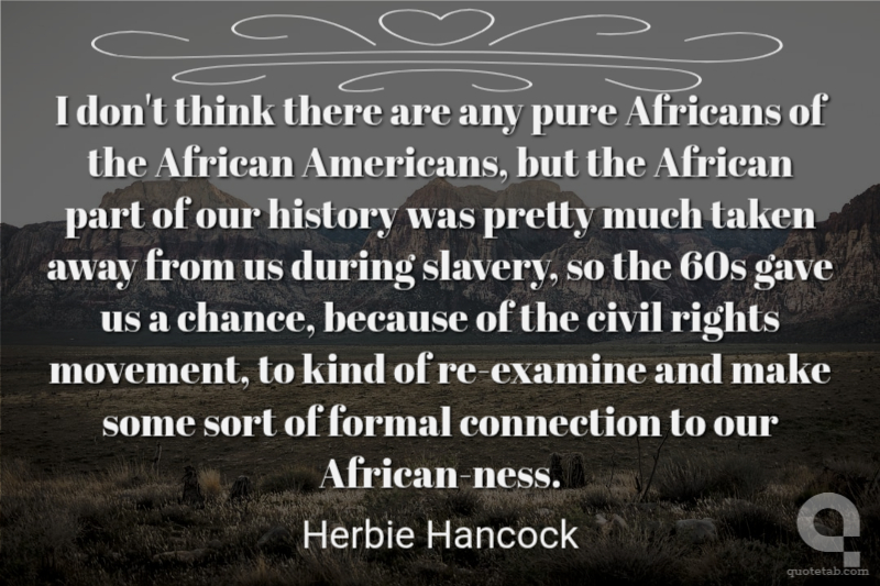 I don't think there are any pure Africans of the African Americans, but the African part of our history was pretty much taken away from us during slavery, so the 60s gave us a chance, because of the civil rights movement, to kind of re-examine and make some sort of formal connection to our African-ness.