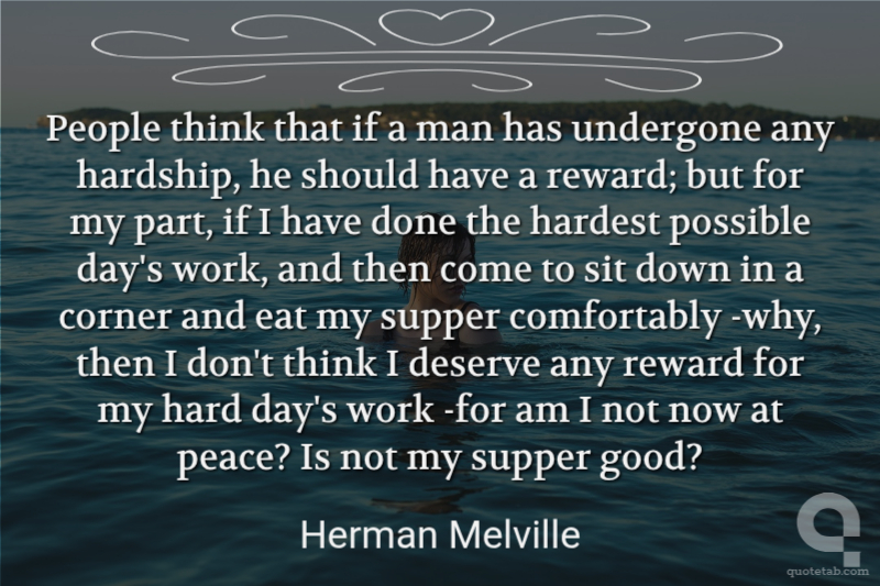 People think that if a man has undergone any hardship, he should have a reward; but for my part, if I have done the hardest possible day's work, and then come to sit down in a corner and eat my supper comfortably -why, then I don't think I deserve any reward for my hard day's work -for am I not now at peace? Is not my supper good?