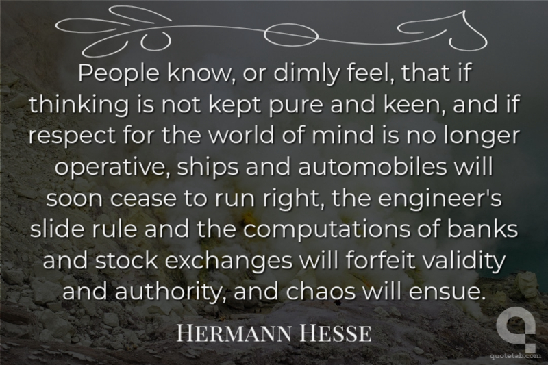 People know, or dimly feel, that if thinking is not kept pure and keen, and if respect for the world of mind is no longer operative, ships and automobiles will soon cease to run right, the engineer's slide rule and the computations of banks and stock exchanges will forfeit validity and authority, and chaos will ensue.