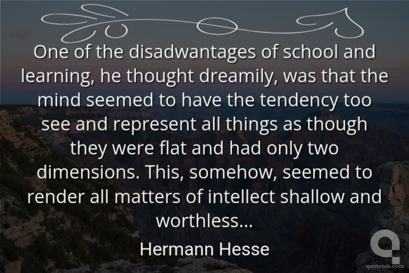 One of the disadwantages of school and learning, he thought dreamily, was that the mind seemed to have the tendency too see and represent all things as though they were flat and had only two dimensions. This, somehow, seemed to render all matters of intellect shallow and worthless...