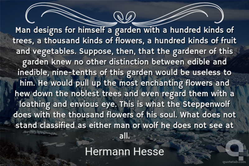 Man designs for himself a garden with a hundred kinds of trees, a thousand kinds of flowers, a hundred kinds of fruit and vegetables. Suppose, then, that the gardener of this garden knew no other distinction between edible and inedible, nine-tenths of this garden would be useless to him. He would pull up the most enchanting flowers and hew down the noblest trees and even regard them with a loathing and envious eye. This is what the Steppenwolf does with the thousand flowers of his soul. What does not stand classified as either man or wolf he does not see at all.