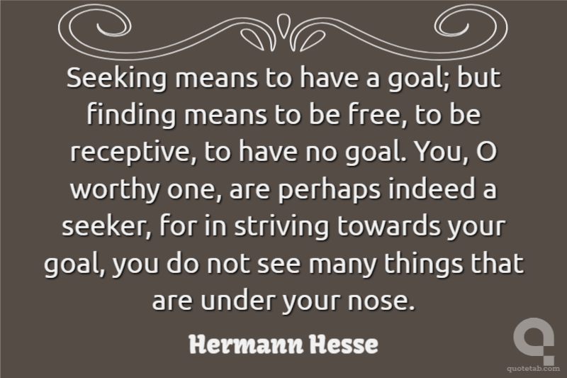 Seeking means to have a goal; but finding means to be free, to be receptive, to have no goal. You, O worthy one, are perhaps indeed a seeker, for in striving towards your goal, you do not see many things that are under your nose.