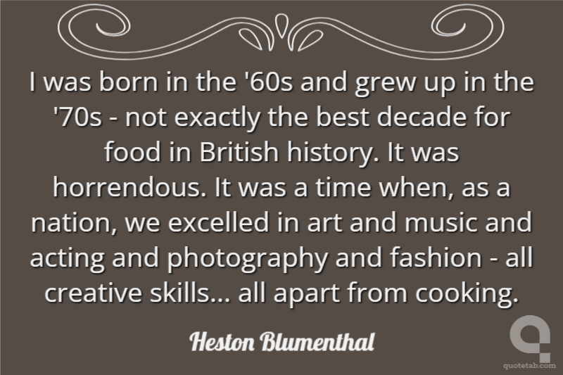 I was born in the '60s and grew up in the '70s - not exactly the best decade for food in British history. It was horrendous. It was a time when, as a nation, we excelled in art and music and acting and photography and fashion - all creative skills... all apart from cooking.