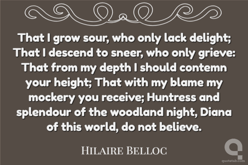 That I grow sour, who only lack delight; That I descend to sneer, who only grieve: That from my depth I should contemn your height; That with my blame my mockery you receive; Huntress and splendour of the woodland night, Diana of this world, do not believe.