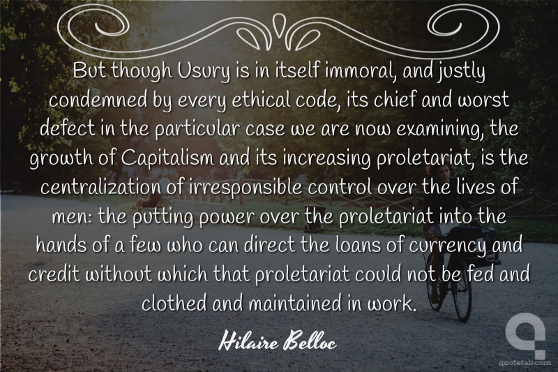 But though Usury is in itself immoral, and justly condemned by every ethical code, its chief and worst defect in the particular case we are now examining, the growth of Capitalism and its increasing proletariat, is the centralization of irresponsible control over the lives of men: the putting power over the proletariat into the hands of a few who can direct the loans of currency and credit without which that proletariat could not be fed and clothed and maintained in work.