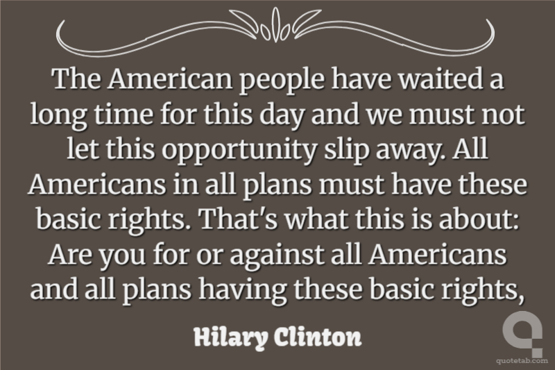 The American people have waited a long time for this day and we must not let this opportunity slip away. All Americans in all plans must have these basic rights. That's what this is about: Are you for or against all Americans and all plans having these basic rights,
